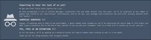 In March 2024, Lin abruptly shut down Incognito Market without warning, stealing at least US $1 million in user deposits. He then attempted to extort users by threatening to publish their transaction histories and cryptocurrency addresses, writing “YES, THIS IS AN EXTORTION!!!” on the site.