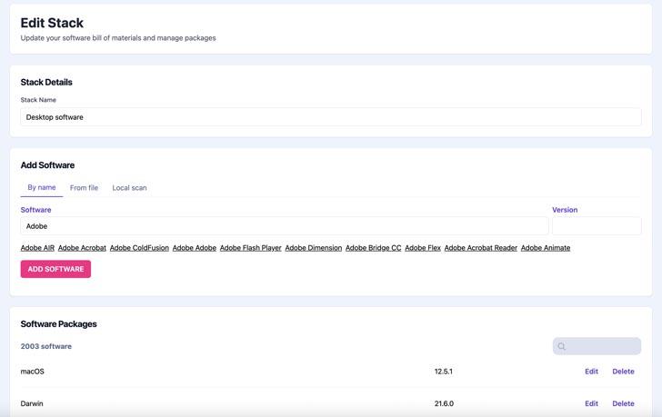 Stacks – upload your software, either manually, via a CSV, XLSX, or SPDX file, or run a stack-building script that automatically generates a full Software Bill of Materials (SBOM) and sends it to SecAlerts. The system supports multiple endpoints, repositories, and custom collections.