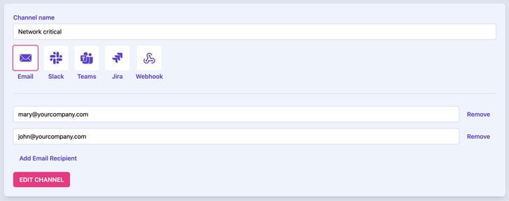 Channels – pinpoint those in your business who need to see the vulnerability information and choose how it’s delivered: email, Slack, Teams, Jira, or Webhook.
