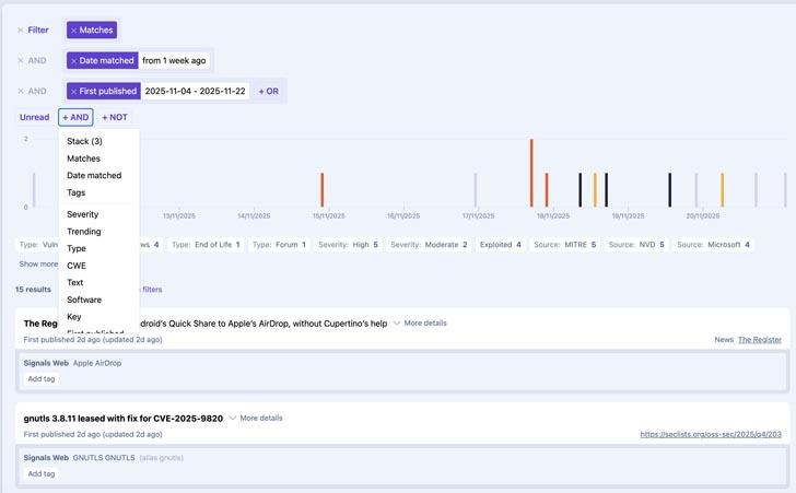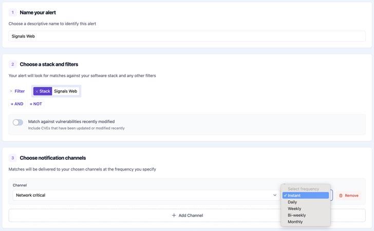 Alerts – bring your Stacks and Channels together. Choose the frequency of notifications – from hourly to monthly – and apply filters such as severity, trending, exploited, and EPSS.