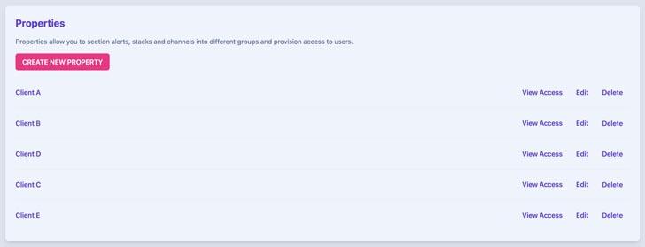 If you are an MSSP or your business has, e.g., several departments, each with its own software, Properties enables you to give each client/department its own Stacks, Channels, and Alerts unique to them. This allows you to manage everything in one place and maintain clear separation between clients/departments.