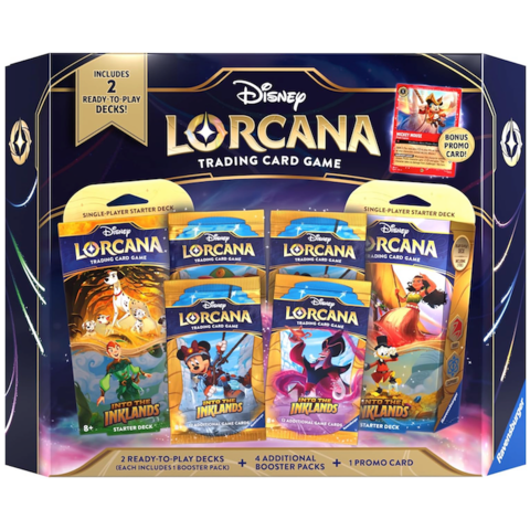 The bundle comes with both Into the Inklands Starter Decks–valued at $17 each–four 12-card Booster Packs, and the adorable Mickey Mouse – Pirate Captain Glimmer Foil promo card.