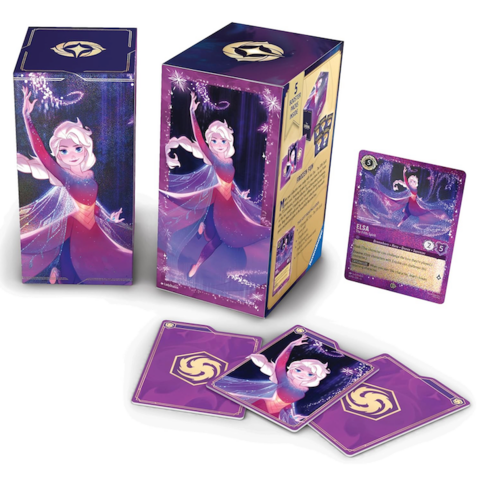 The main draw for collectors is the Elsa – Fifth Spirit Glimmer Foil promo card. The Gift Box also comes with five Disney Lorcana Booster Packs with 12 cards each. These are random packs from different Lorcana sets. You’ll also get an Elsa-themed storage box for 252 cards.
