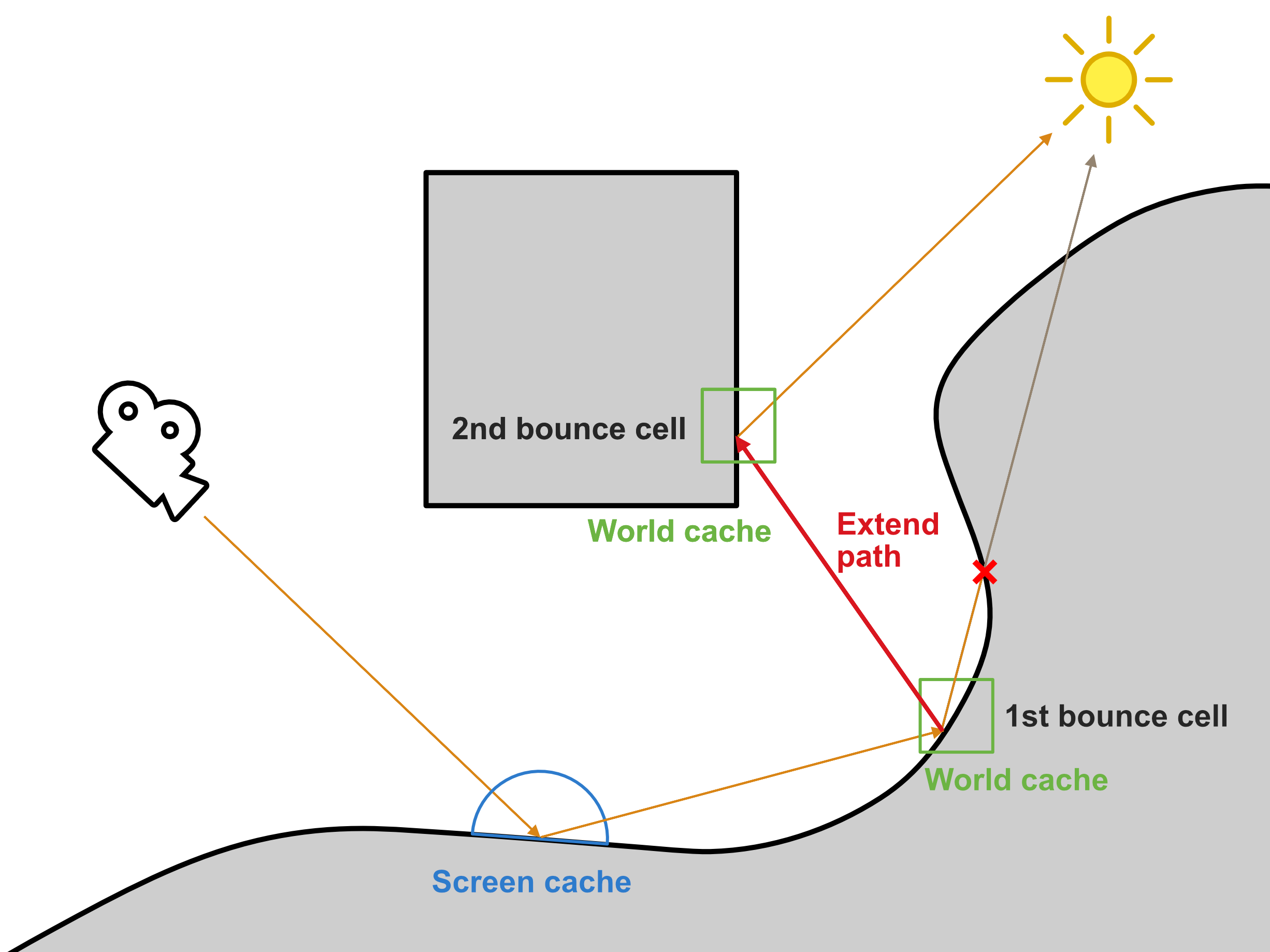 - Note: It’s important to multiply the contribution from the 2nd bounce cell with the BRDF at the 1st bounce cell when resolving, in order to approximate the rendering equation.