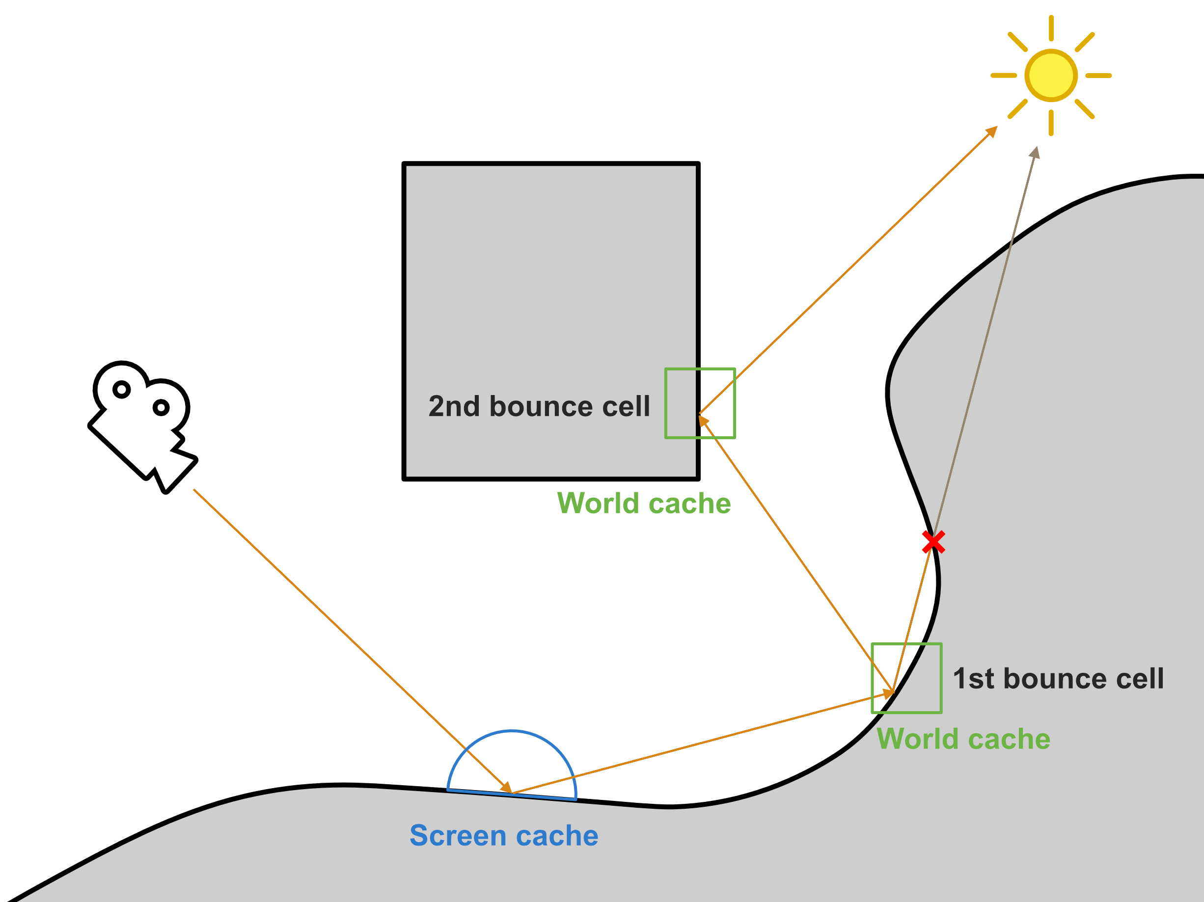 - Two separate Monte Carlo estimators are accumulated for each 1st bounce cell in order to keep track of the samples of direct and indirect light, respectively: